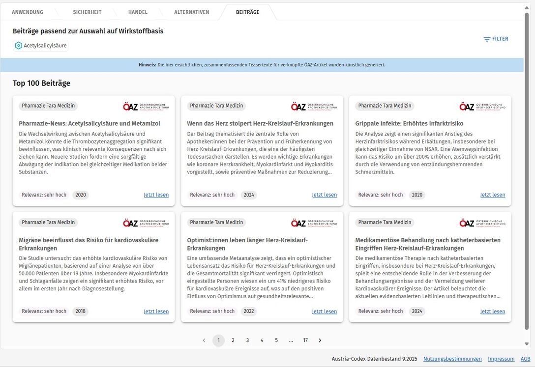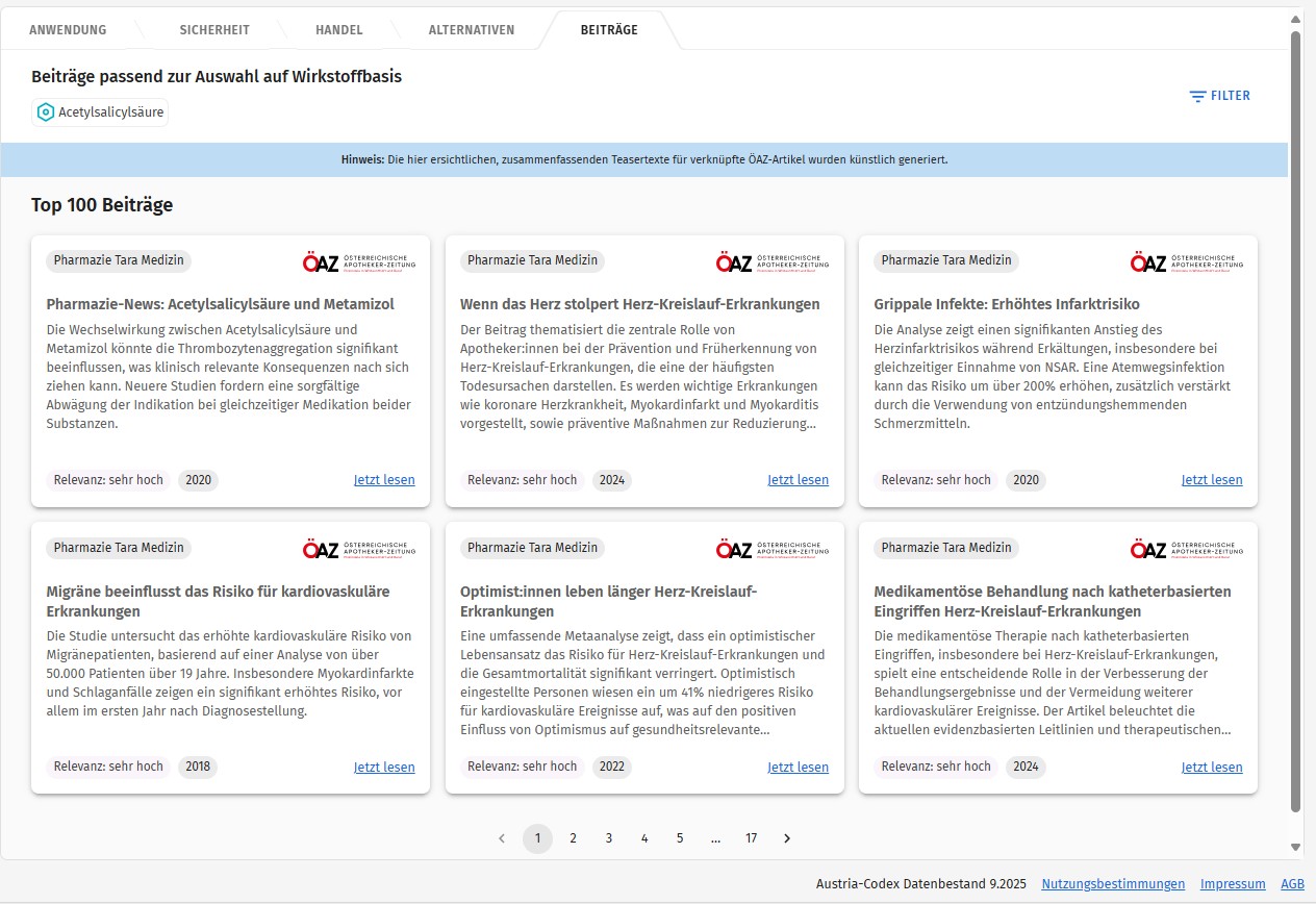 Der Austria-Codex Online findet über die ausgewählten Wirkstoffe passende Artikel auf oeaz.at und zeigt diese mit Kurzbeschreibung im Bereich „Beiträge“. Alle Artikel sind unterteilt sowie filterbar nach „Relevanz“ (zur Wirkstoffauswahl) und „Erscheinungsjahr“. Wer tiefer einsteigen will, wechselt direkt zum Artikel auf oeaz.at – als PDF oder online.
